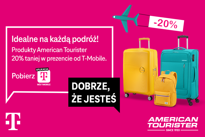 Przed nami majówka, wakacje i wiele okazji do odkrywania nowych miejsc. Aby wyruszyć w podróż, najpierw dobrze się jednak spakować. Najlepiej wygodnie, w funkcjonalne walizki oraz plecaki. Dla naszych klientów indywidualnych, którzy chcieliby uzupełnić swój asortyment podróżny, przygotowaliśmy zniżkę 20% na wszystkie produkty w sklepie American Tourister. Prezent można odebrać od piątku 8 kwietnia do wtorku 12 kwietnia w aplikacji „Mój T‑Mobile”.