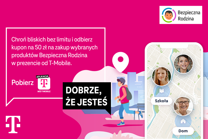 Aby skorzystać z promocyjnej oferty, należy po prostu aktywować pakiet „Bezpieczna Rodzina” w aplikacji „Mój T‑Mobile” od 28 kwietnia do 3 maja. Dzięki temu użytkownik będzie miał dostęp do nielimitowanej liczby lokalizowanych bliskich, nielimitowanej liczby stref, a także będzie mógł sprawdzać nielimitowaną liczbę historii lokalizacji. W aplikacji oraz na stronie https://bezpiecznarodzina.pl/dobrze-jestes" będzie też można odebrać unikalny, jednorazowy kod zniżkowy w wysokości 50 zł na produkty „Bezpieczna Rodzina” z kategorii: Dziecko, Senior, Zwierzę, Auto.