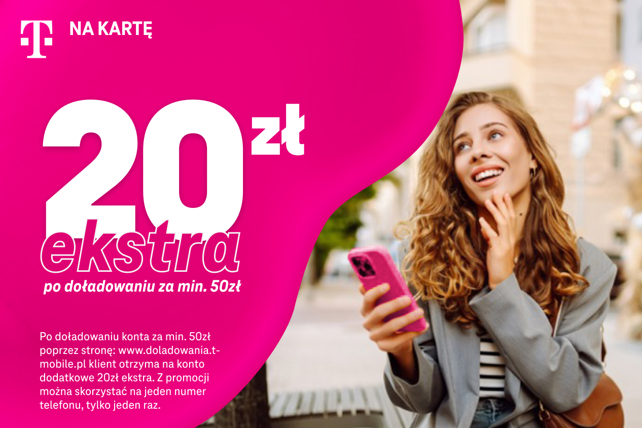 W T-Mobile zawsze chcemy zapewniać klientom maksimum satysfakcji z naszych usług, a przy tym kochamy niespodzianki! Stąd właśnie nasz pomysł na nową promocję dla użytkowników ofert na kartę, w ramach której po doładowaniu konta, dorzucamy dodatkowe środki w wysokości 20 zł! Dzięki temu jeszcze dłużej można surfować po internecie czy wysyłać SMSy i MMSy do przyjaciół.